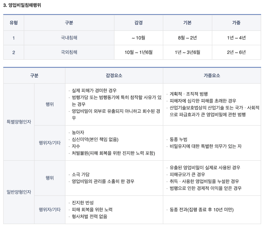 법원의 영업비밀침해행위 양형기준은 아래와 같습니다.